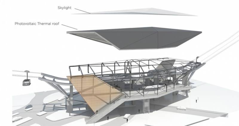 燈光從結構組件之間的縫隙中射出,創(chuàng)造出纖細銳利的線條,夜幕降臨之后能產生強調索道塔外輪廓的微妙效果。同時,纜車站設計不僅遵從了自然路徑尋找與公共安全原則,同時配備強大的標志系統(tǒng),使得建筑本身成為城市中非常容易辨別的目標點。車站所用能量由建筑本身提供,屋頂結構中內置的光電熱混合太陽能收集器(PVT)可以為建筑提供照明電能和地面及樓層的熱能。