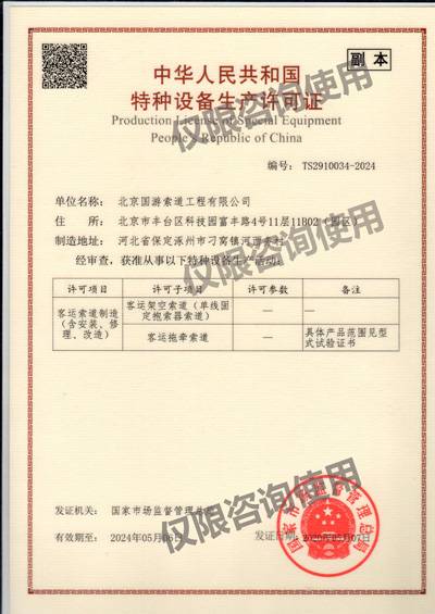 北京國游索道工程有限公司近日取得由國家市場監(jiān)督管理總局頒發(fā)的新客運索道特種設備生產(chǎn)許可證,成為國內(nèi)第一批獲得該許可證的企業(yè)。客運索道特種設備生產(chǎn)許可是國家根據(jù)《中華人民共和國特種設備安全法》等法律法規(guī)規(guī)定,首次在客運索道行業(yè)施行的涵蓋設計、整機制造、安裝、改造、修理完整流程的生產(chǎn)許可制度。獲得許可單位具有與許可范圍相適應的資源條件,建立并且有效實施與許可范圍相適應的質(zhì)量保證體系、安全管理制度等,具備保障客運索道特種設備安全性能的技術能力。索道生產(chǎn)許可證的取得證明了我公司在索道行業(yè)內(nèi)先進位置。未來我們將以此為契機不斷進取,為國內(nèi)旅游索道事業(yè)的發(fā)展和索道安全而做出積極的貢獻。