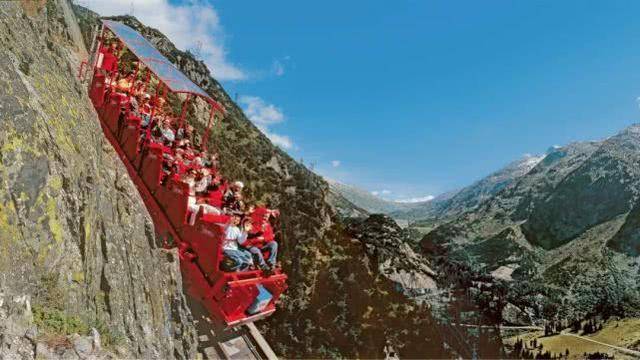 瑞士因納特基興的蓋爾默纜車是一個(gè)絕對能激發(fā)你的腎上腺素的纜車,它的傾斜角度達(dá)106度,是歐洲最陡的登山纜車。蓋爾莫纜車建于1926年,最初是為了給蓋爾默水壩運(yùn)送建材而建造的,從2001年開始開放成為旅游景點(diǎn)。纜車底部的Handegg村被壯觀的山脈環(huán)抱,纜車上端則是著名的蓋爾默湖(Gelmersee)湖。