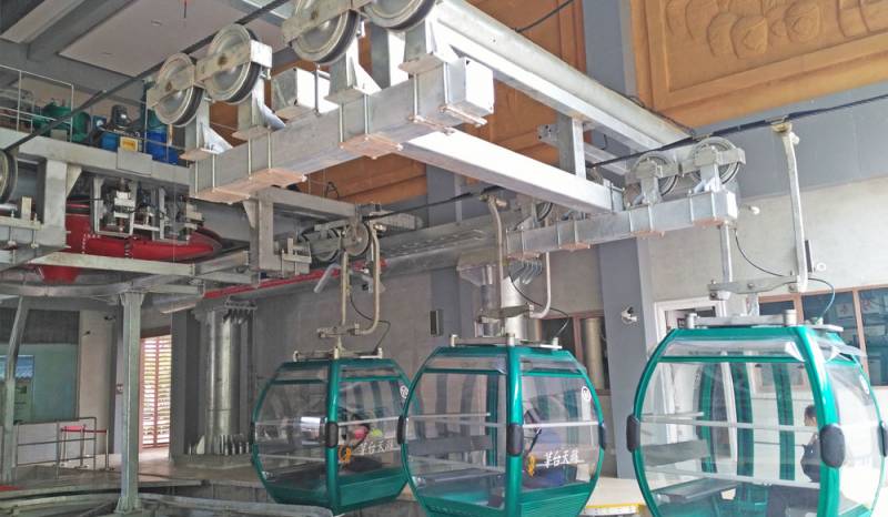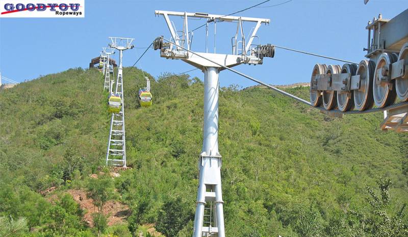 脈動(dòng)車組式索道是在線路上作脈動(dòng)運(yùn)行( 快行- 慢行-快行-慢行)的客運(yùn)索道,在運(yùn)載索上等距 離用固定抱索器懸掛雙倍數(shù)成組車廂,車廂進(jìn)站 以 0.3-0.5 米每秒運(yùn)行, 車廂出站后加速以3-4 米每秒運(yùn)行。其特點(diǎn)是能夠適應(yīng)比較復(fù)雜的地形 如地形起伏較大, 跨越江河海灣, 對自然環(huán)境 方面有更大的適應(yīng)性。乘客易于上下車。每個(gè)吊廂可以乘坐6個(gè)人。